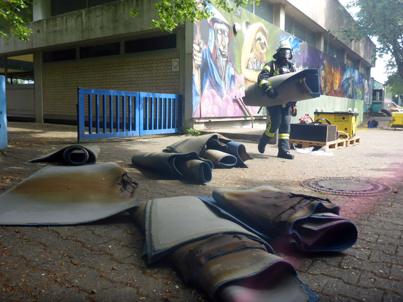 Zusammen mit der nachalarmierten Freiwilligen Feuerwehr Bretzenheim räumte die Berufsfeuerwehr rund 400 betroffene Matten per Hand ins Freie, wo diese abgelöscht wurden. Zusätzlich musste die Halle mit drei Lüftern vom Brandrauch befreit werden.