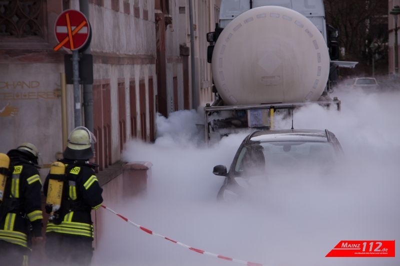Die Feuerwehr wurde heute um 12:45 Uhr in die Walpodenstraße zu einem Gasaustritt alarmiert. An einem Tanklastzug mit rund 21 Tonnen tiefkalt verflüssigtem Kohlendioxid trat beim Entladevorgang Gas aus. Nachdem es zunächst vorübergehend gelungen war, den Stoffaustritt weitgehend zu stoppen, strömte kurz darauf schlagartig erneut CO2 aus. An der Austrittsstelle kam es zu Vereisungen der Armaturen und zu einer starken Sichtbehinderung durch den CO2-Nebel.