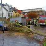 Ein Baum war auf zwei parkende Pkw gestürzt und blockierte dadurch die Straße. Wir zerkleinerten den Baum mittels Motorkettensäge und räumten die Straße wieder frei. |
