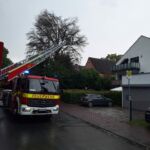 Am Sonntagabend wurden wir zu 2 unwetterbedingten Einsatzstellen gerufen und rückten mit HLF und LF20 KatS aus. Das HLF musste gemeinsam mit einer Drehleiter der Berufsfeuerwehr einen großen abgebrochenen Ast aus einer Baumkrone entfernen, der drohte herunterzustürzen. Das LF20 KatS entfernte einen Baum, der auf einen Pkw gefallen war und den Bereich blockierte. Glücklicherweise kamen keine Personen zu Schaden. |
